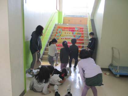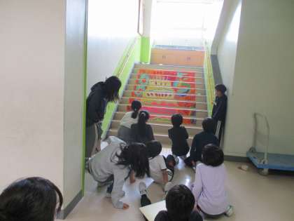 出来上がった階段アートを、ちゃんと元通りの絵が浮き出て見えるか、みんなで確かめます。確認していると、視界を友達の体が遮ってしまって・・・「ねぇ、座って。見えないよ。」「もうちょっとしゃがんで。」などと声を掛け合って確認していました。
