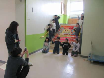 最後に嬉しそうに階段アートを囲んで記念撮影をしました。
