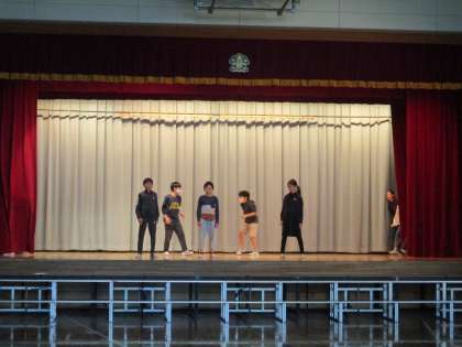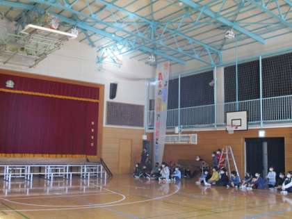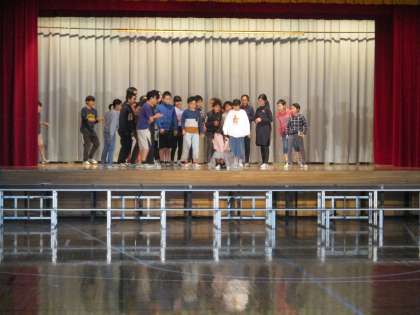 子どもたちが作った学芸会のスローガン「思いよ届け!!最高の演技で笑顔と感動を!!」が天井から垂れ幕となってさがっています。