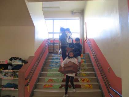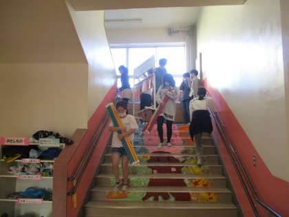 学芸会が終わって、体育館内の物品を元通りに運び込みます。今日からはこれまで学校全体の仕事を担ってきた6年生から、5年生がその仕事を引き継ぎます。たくさんの体育で使用する道具類を運んでくれました。
