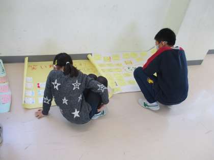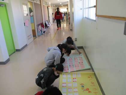お互いの劇をテレビを通して鑑賞し、思いをカードに書いて、まとめたものを各学年に届けます。メッセージの貼られた模造紙が掲示されるのを待てずに、もう読み始めています。「こんなことが書かれているよ。」「どれどれ。」などの声が聞かれます。