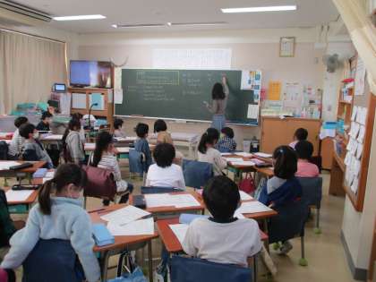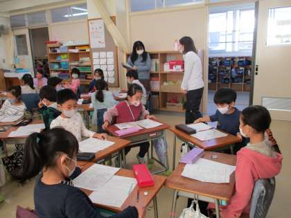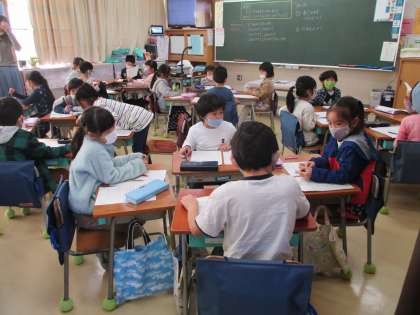 印を付けた仕事の数を自分と家族で比べました。グループになって、友達のワークシートの中身とも比べて考えました。その後、クラス全体でも、印の数がいくつだったかを発表していき、どんな仕事に印がついたのかを確認し、数の違いについて考えました。すると、家の人は家族のためにいろいろな仕事をしてくれているということに気付く子が出てきました。