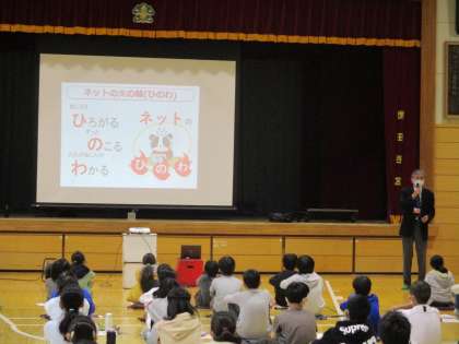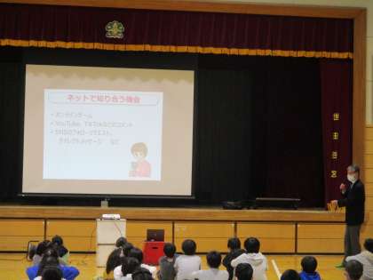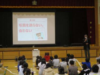 インターネット上の情報は広がり、ずっと残り、誰が出したか分かるもので、ネットの「ひ・の・わ」にはまらないことが大切とのお話がありました。オンラインゲーム、YouTubeやTikTokでのコメント、SNSのダイレクトメッセージなど、知らない人と知り合うことができるものがネットの中にはたくさんあります。