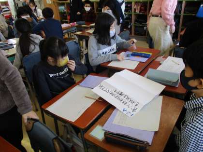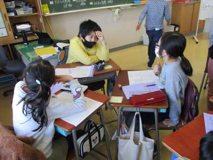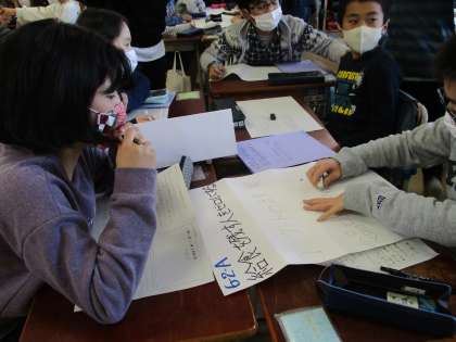 続いて自分の担当するクラスの子どもたちに何を伝えると効果的かを話し合いました。その学年に応じた言葉遣いや量感についての表現の仕方などを考えました。「1年生だから・・・。」「6年生だったら、ここは・・・。」などのつぶやきが聞こえてきました。