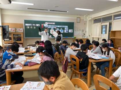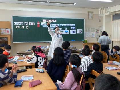 今日はしょうゆものしり博士が来校し、3年生に授業をしてくださいました。しょうゆの味、色、香りはどのようにして生まれるのか、しょうゆの原材料はどのようなものがあるのかなどのお話を聞きました。