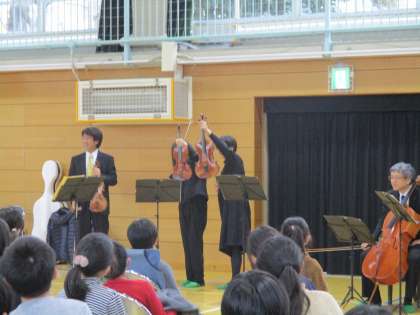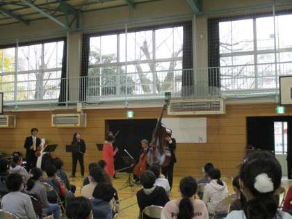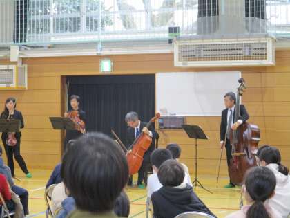 バイオリンとビオラの大きさの違いを間近で見せていただいたり、大きなコントラバスを持ち上げて見せていただいたり、それぞれの楽器の音色を生かした曲を聞かせていただいたりと、音楽を生で楽しむ時間となりました。