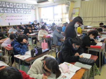 身の回りをきれいにして住みやすくする工夫についての学習です。机の中のお道具箱の中身をどのように配置しておくと、使いやすくなるかを絵を描きながら考えています。