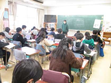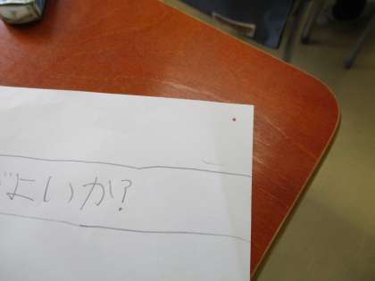 「映画は映画館で観るのと家で観るのととどちらがよいか」のディベートの準備をしています。映画館で観る、家で観る、ディベートの審判のいずれかの立場になります。先生から配られる用紙に赤丸がついていると「映画館で観る」の立場になります。