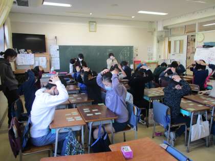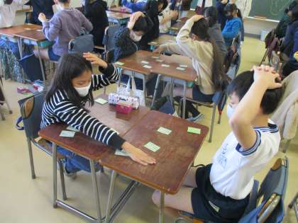 百人一首クラブでは、2人組で対戦をしています。5年生が読み札を読むと、上の句の途中でも札を取っている子がたくさんいます。多くの句を暗記していることが分かります。