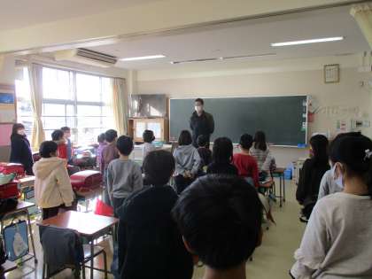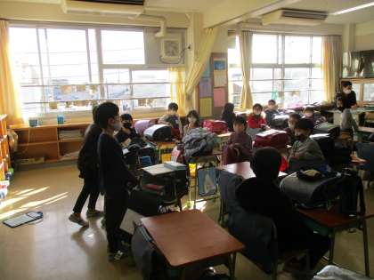 帰りの会の様子です。日直の子どもたちが「今日のハッピー!」として、一日の学校生活の中で嬉しかったことを報告しています。体育の長距離走で10周以上走り切ったことが嬉しいと感じている子が多くいました。発表する友達の方に体を向けて聞いている子がたくさんいて素敵でした。