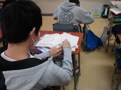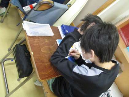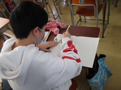 6年生は三角形の形に並んだ黒い丸の数え方を考えています。まずは自分の考えを式と説明の言葉でまとめます。
