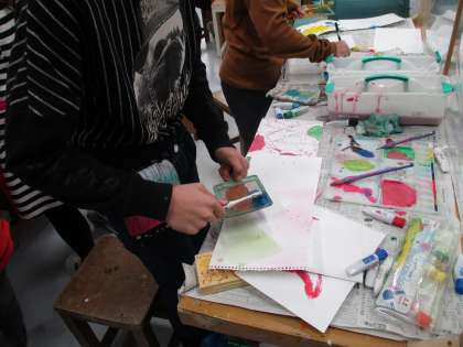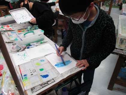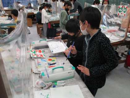 「自分いろがみ」の学習に取り組んでいます。ドリッピング、にじみ、スパッタリング、デカルコマニーのやり方を知り、いろいろ楽しみながら試してみています。多くの表現方法を体験した後、自分のお気に入りの紙の作成をします。