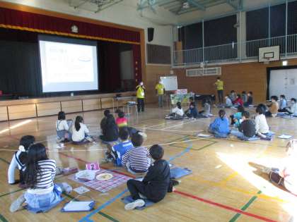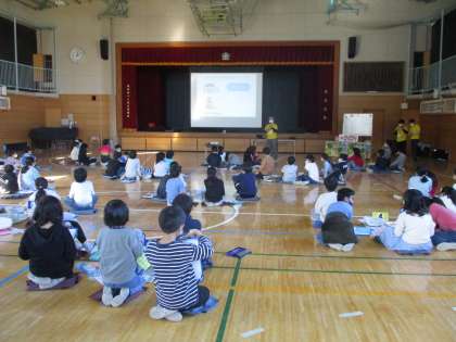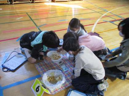 3年生がおいしくおやつを食べるにはどのようなことに気を付けるかについて教えていただいています。一日のおやつの目安量は200キロカロリーです。ポテトチップスでは35グラムとなるので、どのくらいの量になるか、はかりで量っています。