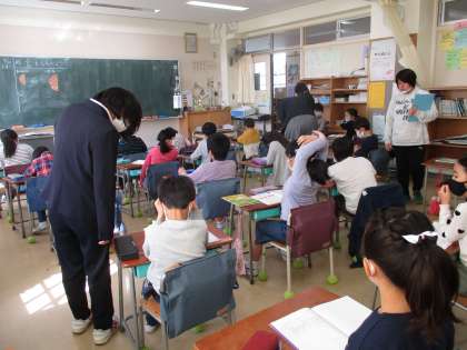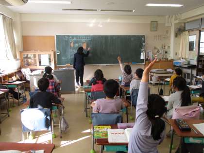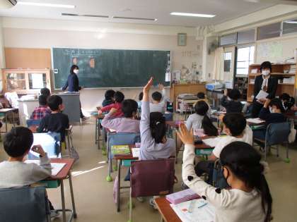 2分の1になった大きさの違うピザの絵を見ながら、同じ2分の1でもどこが違うのかを考えます。まずは自分の考えをノートに書いて、考えをまとめてから発表しています。