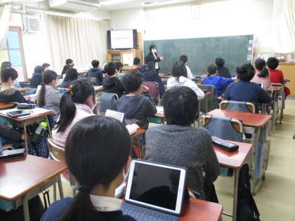 学校薬剤師の先生を講師に、薬物乱用防止に向けたお話をしていただきました。授業で学んだことをタブレットでまとめて、先生にデータで提出しました。