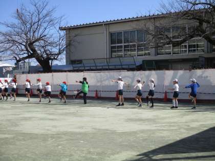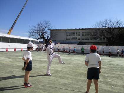 講師の先生が投げ方の見本をみせてくださいました。練習した基本の動きを思い出しながら、ペアの友達に向けてボールを投げました。