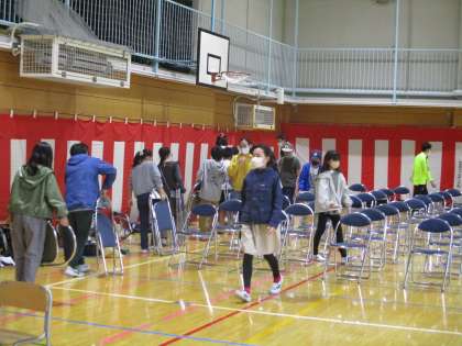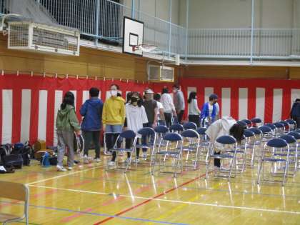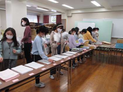 明日の入学式に向けて、新6年生が入学式で配るものを袋詰めしたり、式典会場の準備をしたりしてくれています。
