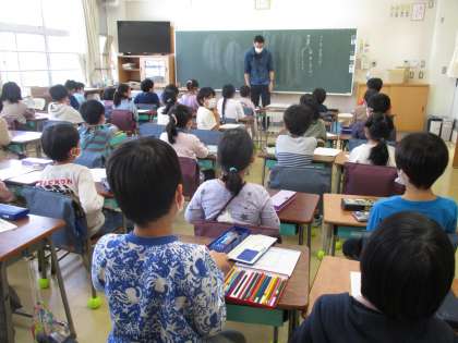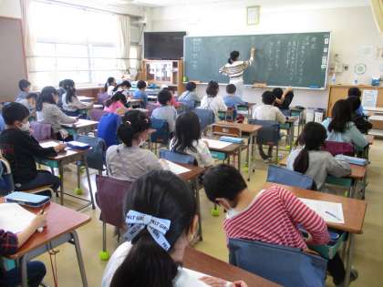 学期の初めはたくさんの配布物があります。どのように自分の分を取るか、先生からの指示を聞いています。