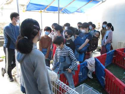 飼育委員会はうさぎ小屋の前に集まって、どのように世話をするかを教わっています。