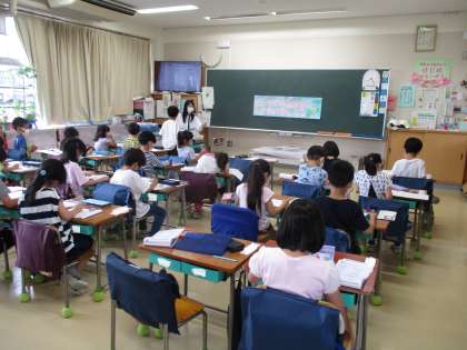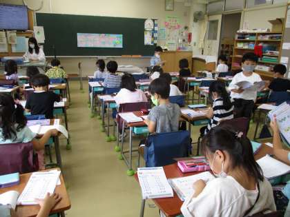 1年生もドリルで「ぜんぶでいくつ」の学習に取り組んでいます。ドリルを見ながらノートに答えを書いています。
