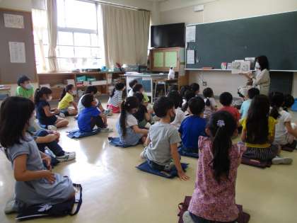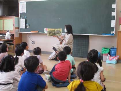 1年生がことり・たんぽぽの会の方に読み聞かせをしていただいています。次々に紹介されるお話を楽しんで聞いています。