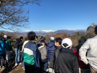 サービスエリアでバスを降りると、周りの景色の素晴らしさを感じました。「こっち来て来て!」と友達を誘ってきれいな景色を一緒に眺めています。