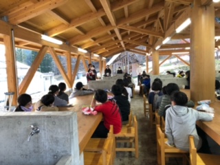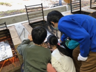 煙が目にしみて、涙がポロポロ。それでもおいしい焼きリンゴを目指して頑張りました。