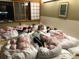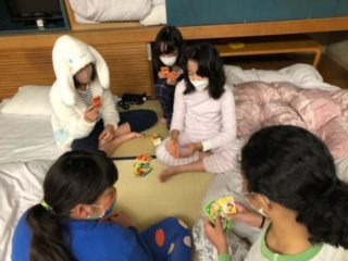 お風呂に入ったあとは、布団を敷いて就寝の準備をしました。係会議までは時間があるので、部屋ごとにレクリエーションをしています。