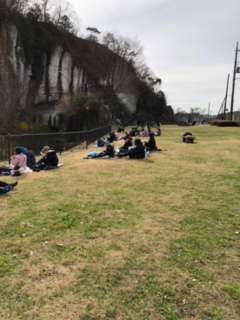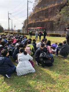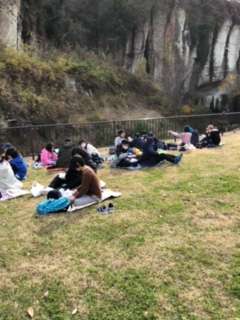大谷資料館近くの広場でお弁当を食べました。近くに川が流れていて、対岸はもちろん大谷石です。きれいな景色です。とても寒いですが、お腹が満たされて満足しています。