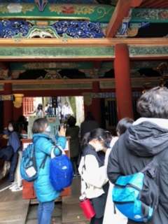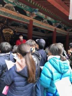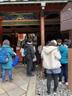 家康公の墓所の入り口となる坂下門に来ました。眠り猫が墓を守るための彫刻として彫られています。強いものが弱いものを虐げない共存共栄の世の中を表しているとの説明を聞き、眠り猫とその裏側の雀を見ながら門をくぐりました。