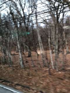 木立の中を見ていた子が「あ、猿がいる。」と気づきました。バスの中は黙っているルールですが、動物発見の時だけは、知らせてよいとの特別ルールになりました。