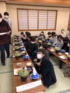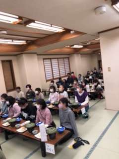 全部の班が揃うまで待っています。できるだけ温かい料理を食べてほしいとの宿舎の方のご配慮で、蓋物はいただきますのあいさつがすむまでは開けずに待ちます。
