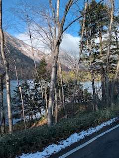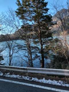 バスの車窓から見える湯の湖はとても美しかったです。途中でなんと野生の猿を見ることができました。道路の脇に「あ、猿がいた。」と気づいた人の声で、みんなが一斉に「え、どこどこ。」と見た後、しばらく進んでいくと道の真ん中に座っている3匹の猿に出会いました。猿はのっそりの歩き去りました。