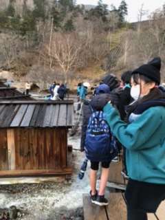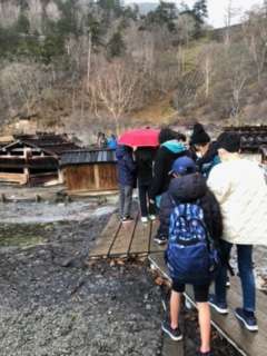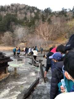 足湯の後は温泉の元となっている湯元温泉に向かいました。あたりはすっかり硫黄の匂いに包まれています。あちこちの水たまりからコポコポ温泉が湧き出しているのが見られました。