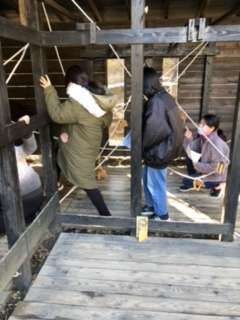 厳しい修行に挑戦中です。鈴を鳴らさないように紐の間をくぐり抜けます。