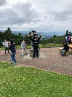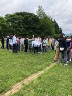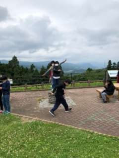 曇っていて、とても涼しいです。大自然を目の当たりにして、気持ちがウキウキしている子がたくさんいます。「ヤッホー!」と声をそろえて言ってみました。