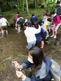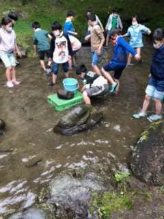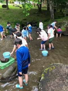 岩の下にいるマスを捕まえようとしますが、素早く泳ぎ手をすり抜けます。なかなか捕まえられません。