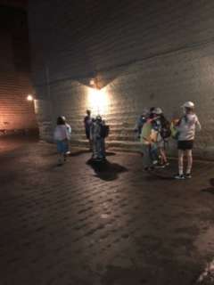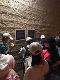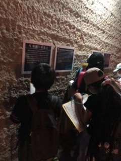 石切場の壁の説明書きを一生懸命読んで、しおりに細かくメモを取りました。上を見上げて、天井が30メートルとかなり高いので驚いていました。