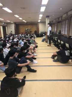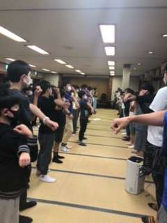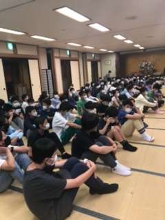 2日目の朝になりました。集合時間より少し前に全員が集まれました。雨が降っているので朝会は大宴会場で行いました。隣の友達にぶつからないよう、工夫して運動をしました。