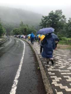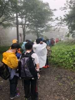 バスを降りたときは雨模様でしたが、湯の湖をバックに学年集合写真を撮りました。その後、歩いて湯滝に行きました。