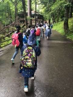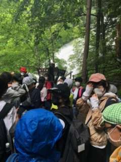 湯滝に到着しました。はるか上から落ちてくる水しぶきを見ながら、班ごとに写真を撮りました。雨も上がってきて、曇り空になりました。