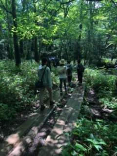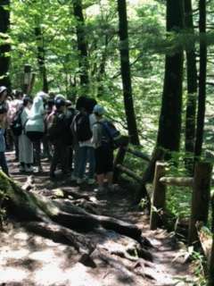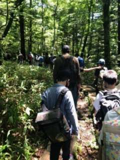 クマの目撃情報があるので、教員は鈴を鳴らし続け、クラス単位の集団行動で歩きました。午前中の雨で所々かなりぬかるんでいました。