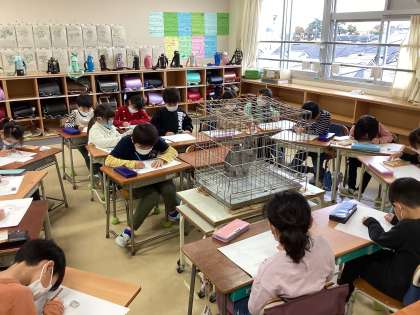 学校で飼育しているうさぎを教室に連れてきて描きました。うごくうさぎさんに苦戦しながら、かわいらしさに目を細めながら真剣に描いていました。