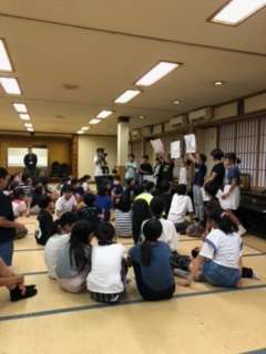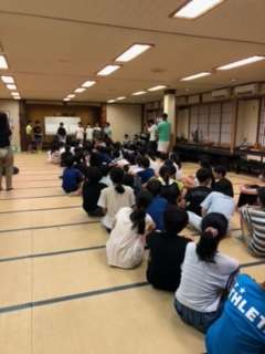 続いてお絵描きリレーをしました。クラスごと男女一列に並んで、順に「三猿」の絵を完成させていきます。