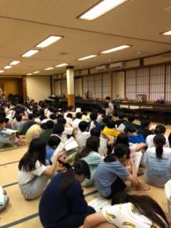 2日目も終わりに近づきました。明日の予定で変更があるため、就寝の準備が終わらせた状態で、もう一度広間に集まりました。明日の日光江戸村への到着時刻を早めにするため、起床後すぐに部屋の片付けや荷物の準備に取り掛かり、朝会に集合することが伝えられました。日光江戸村の開門の儀を見られるようにするためです。みんな準備を早くする気満々で話を聞いていました。