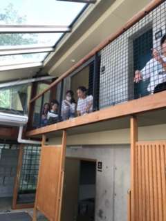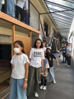 各部屋に入室してからすぐに避難訓練をしました。部屋の前に整列し、点呼した後!先生に報告しました。