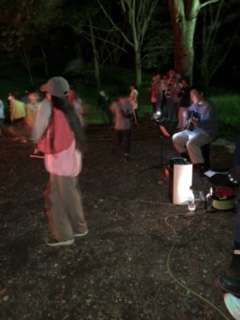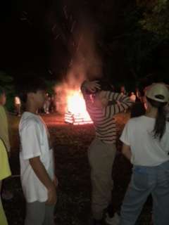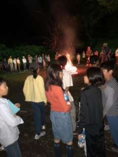 キャンプファイヤーが始まりました。真っ暗な中、赤々と燃え上がる火を見ながら盛り上がっていました。