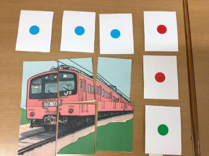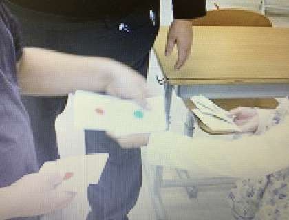 「カード交換」は、他の子に声をかけ、カードを1枚ずつ交換してもらいながら、自分の必要なカードを集めて、絵を完成させる活動です。目的意識をもって丁寧に相手に伝える、お願いすることが必要になります。最初に、どのように相手に伝えたら良いか担当教員と練習しましたが、本番では練習したことを活かしながら声をかける姿が見られました。