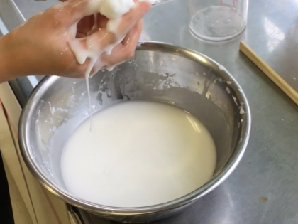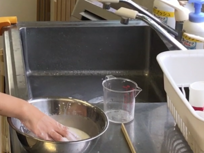 割り箸でゆっくりかき混ぜながら、水を100ml入れます。