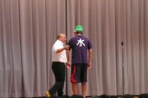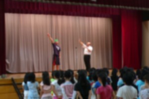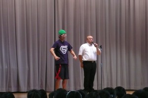 でも、今日の児童朝会には水泳マンがかけつけてくれました。